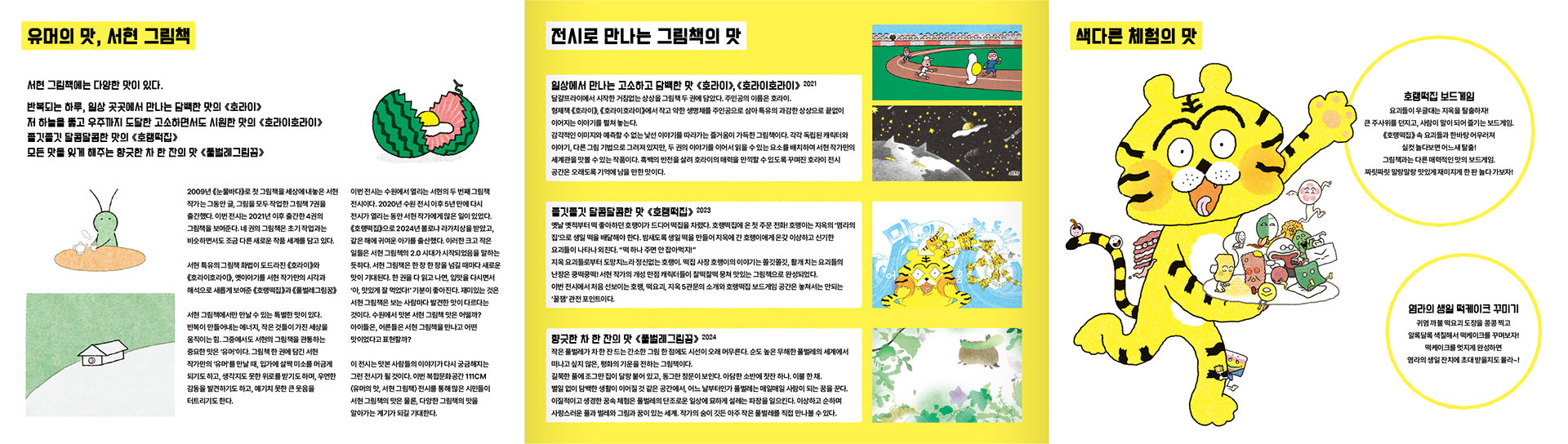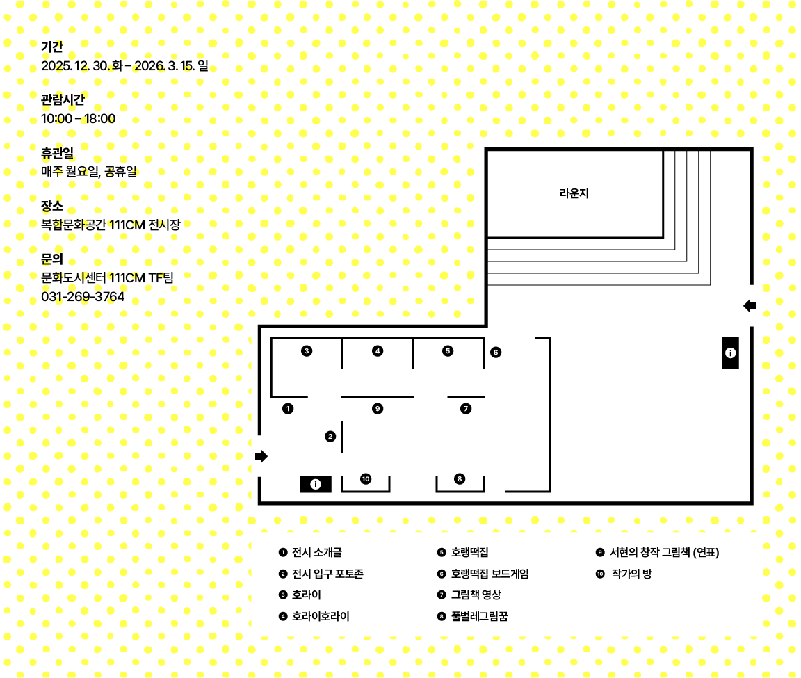 서현 작가의 원화 작품을 소개하는 전시입니다. 2024년 볼로냐 라가치상 코믹스 부문 얼리리더 스페셜 멘션을 받은 『호랭떡집』을 비롯해 『풀벌레그림꿈』, 『호라이』, 『호라이호라이』의 원화를 함께 선보입니다. 작가 특유의 유머와 상상력을 가까이에서 만날 수 있습니다.